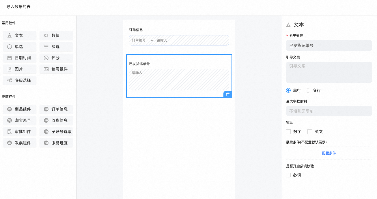 添加工作表组件, 使用<订单组件>用于订单号的匹配, 其他的附件信息使用<文本组件>即可。
