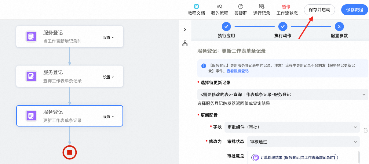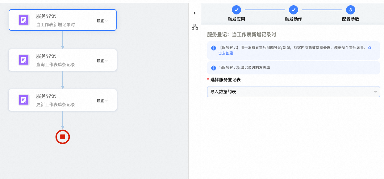 第三个节点,选择 应用:服务登记;执行动作:更新工作表单条记录。