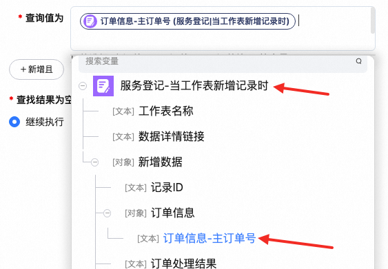 此处的逻辑为,用A表新增的这条记录中的订单号去查询B表中订单信息中是否有这个订单号的记录,如果有流程就继续,如果没有流程就终止。
