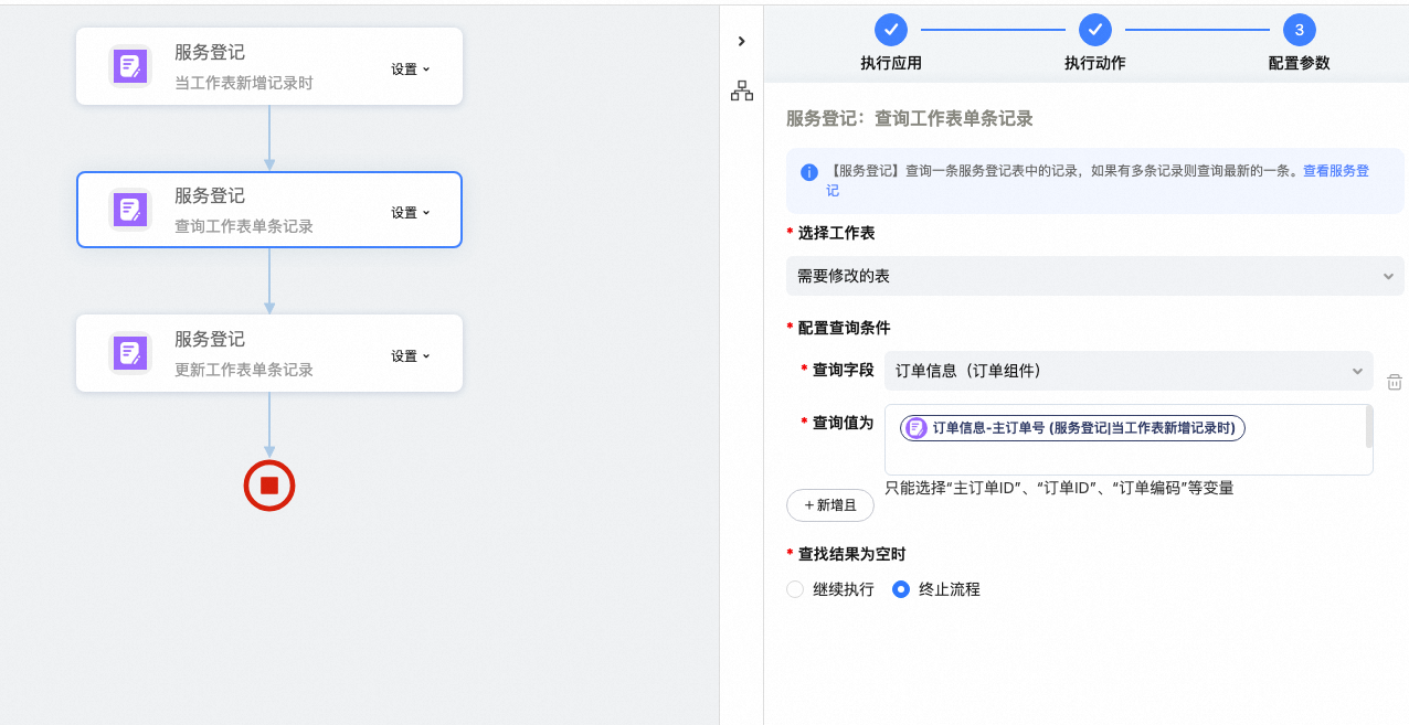 第二个节点,选择 应用:服务登记;执行动作:查询工作表单条记录。