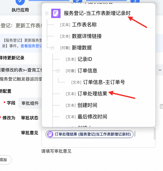 配置更新的字段选择需要被修改的B表中的字段, 以审批组件为例, 字段:审批组件; 审批状态:审核通过 ; 审批意见: 当工作表新增记录时节点中的 订单处理结果 。