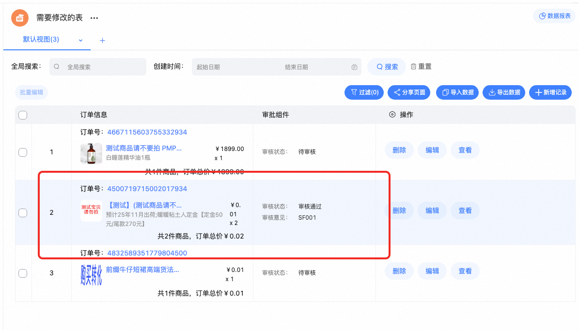 查看<需要修改的表>, 对应订单的记录已经自动变成了 审核通过,审核意见也写入已发货的运单号的值。